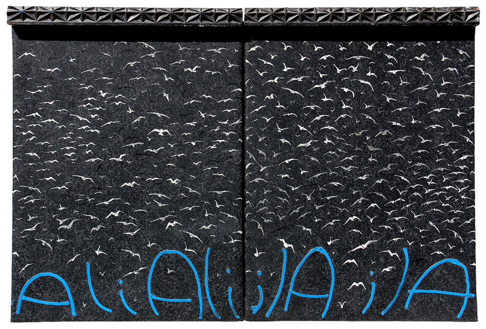 Aldo MONDINO (Torino 1938-10-04 Torino 2005-03-10) Ali Ali 1997 olio e tecnica mista su linoleum cm. 80 x 120Scritta, firma, data, titolo "Riptic Alighiero, Mondino, 97, Ali Ali" (al retro) Autentica dell'artista su fotografia