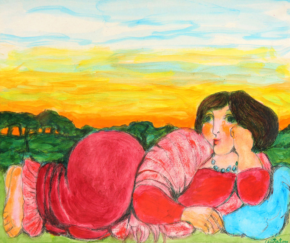 Domenico CANTATORE (Ruvo di Puglia 1906-03-16 Parigi 1998-05-22) Odalisca 1994 acrilico su carta intelata cm. 47 x 64Firma "Cantatore" (in basso a destra) Timbro dell'Archivio Generale Il Mappamondo, Milano (al retro) Autentica dell'artista su fotografia, con timbro dell'Archivio Generale Il Mappamondo, con n. 451