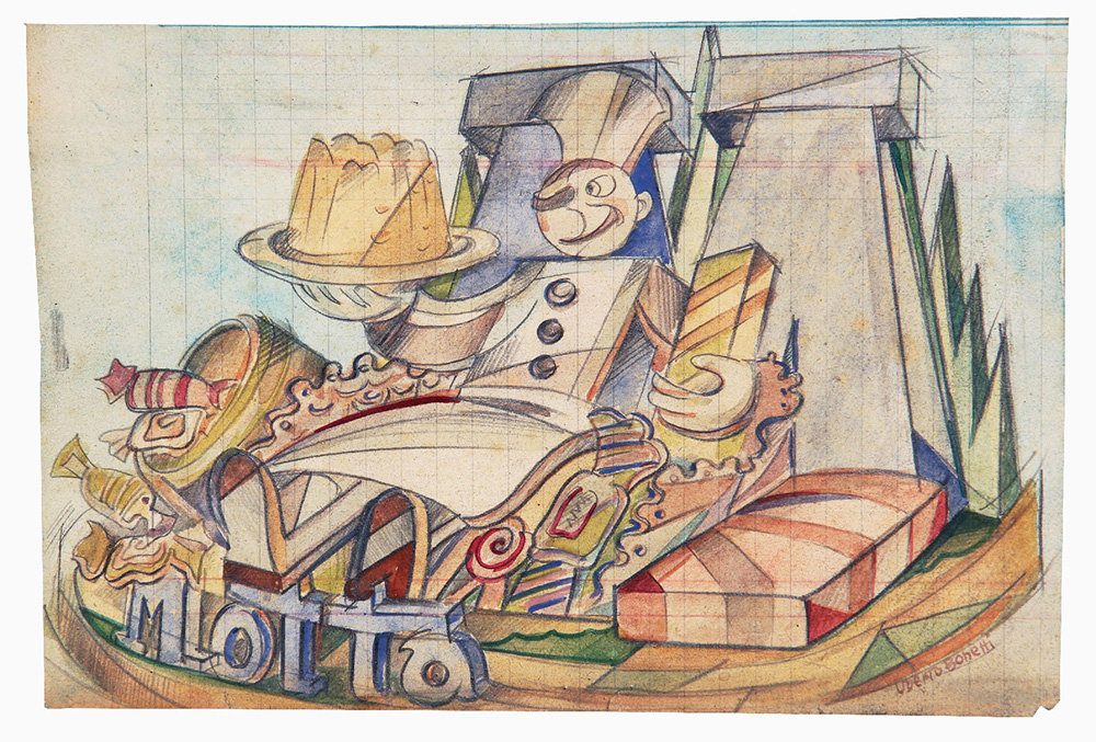 Uberto BONETTI (Viareggio 1909 - 1993 ) Bozzetto per carro pubblicitario anni 30 (1930 - 1939) tecnica mista su carta cm. 16.5 x 24.5Firma "Uberto Bonetti" (in basso a destra) Autentica a cura delle figlie Adriana e Maria Elda Bonetti, con n. di archivio 819