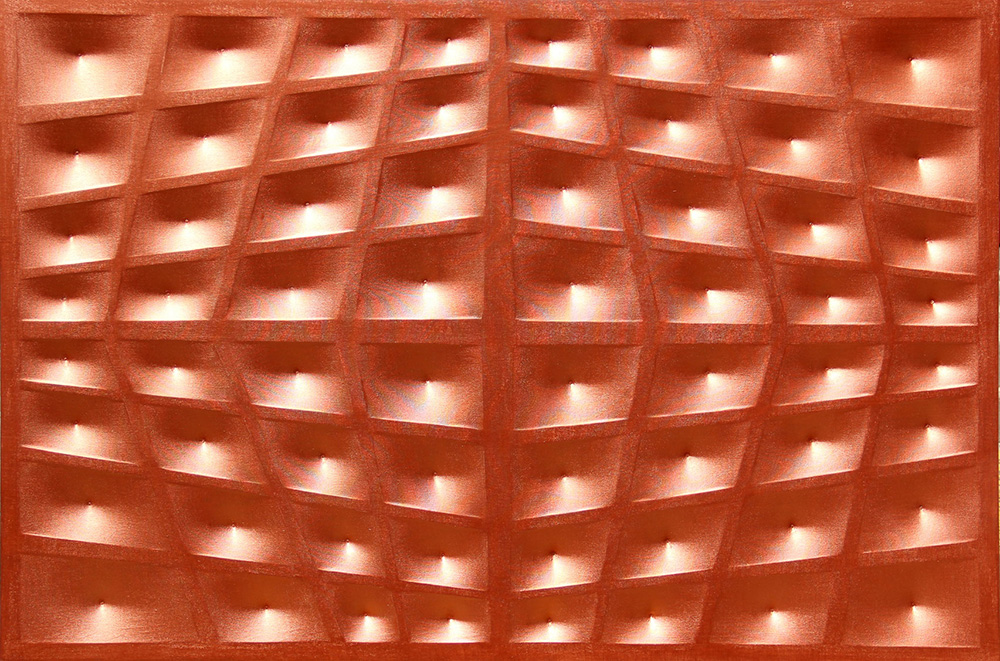Stefano BRUNELLO (Ferrara 1967 ) Struttura divergente assimetrica 2016 acrilico su tela estroflessa riportata su tavola cm. 80 x 120"Cesare Berlingeri Stefano Brunello Piegata progressione", a cura di L. Caprile, catalogo della mostra al Museoteatro della Commenda di Prè, Genova, 3 febbraio-4 marzo 2017, Poleschi Arte, Milano, Muma, Genova p. 24Firma, data, titolo, numerazione "Brunello, 2016, Struttura divergente assimetrica, AS044/16" (al retro) Autentica dell'artista su fotografia