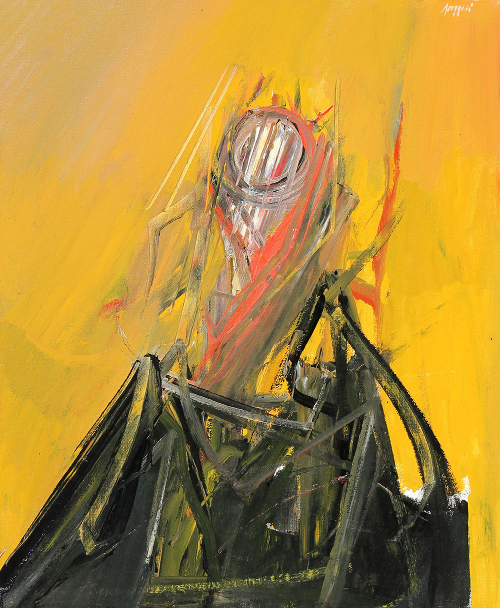 Piero RUGGERI (Torino 1930-04-27 Torino 2009-05-14) Figura gialla 1972 olio su tela cm. 60 x 50Firma "Ruggeri" (in alto a destra) Firma, data, titolo "Ruggeri, 1972, Figura gialla"; timbro della galleria Sant'Agostino, Torino (al retro) Autentica dell'artista su fotografia, con timbro della galleria Sant'Agostino, Torino