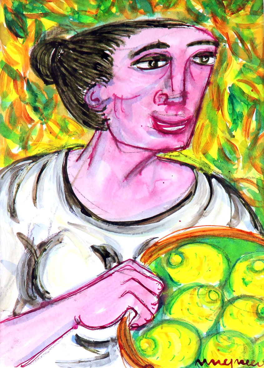 Giuseppe MIGNECO (Messina 1908-02-09 Milano 1997-02-28) Donna con limoni 1989 china su carta cm. 29 x 20.5Firma "Migneco" (in basso a destra) Autentica dell'artista su fotografia, con timbro del Catalogo Generale Giuseppe Migneco, Bonaparte Milano, con n. 4238