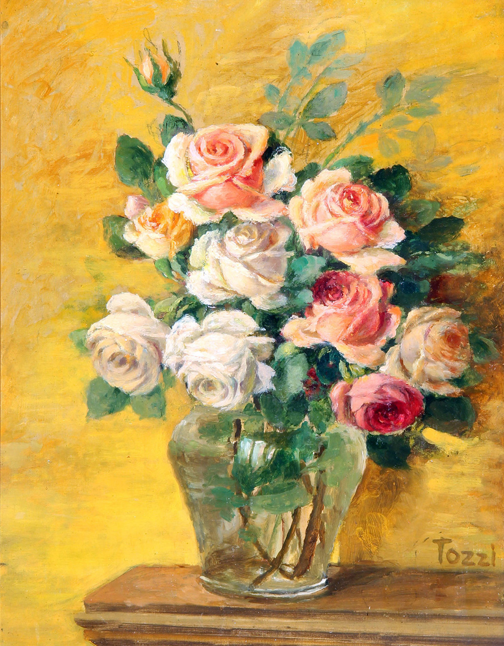 Mario TOZZI (Fossombrone (Ps) 1895-10-30 Saint Jean du Gard 1979-09-08) Vaso di rose 1916 olio su masonite cm. 32 x 22.5Firma "Tozzi" (in basso a destra) Autentica dell'Archivio Mario Tozzi, con n. 2443 e prot. n. 122A/17