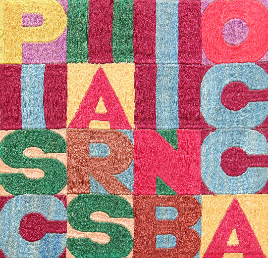 Alighiero BOETTI (Torino 1940-12-16 Roma 1994-04-24) Pisciarsi in bocca 1979 arazzo su tela cm. 23 x 24Firma, luogo, data "Alighiero e Boetti, Kabul, 1979" (al retro) Autentica dell'Archivio Alighiero Boetti con n. 79RL11