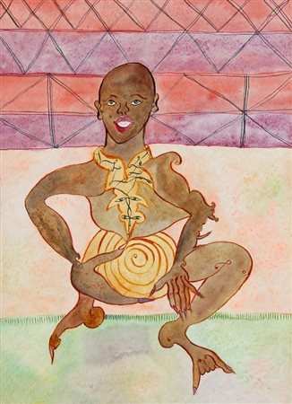 Luigi ONTANI (Vergato 1943-11-24 ) Abdoullà in Burkina stà anni 90 (1990 - 1999) acquarello su carta cm. 48 x 36Titolo, firma "Abdoullà in Burkina stà, Ontani, Bobo" (al retro) Certificato di provenienza delle Gallerie Orler, Favaro Veneto