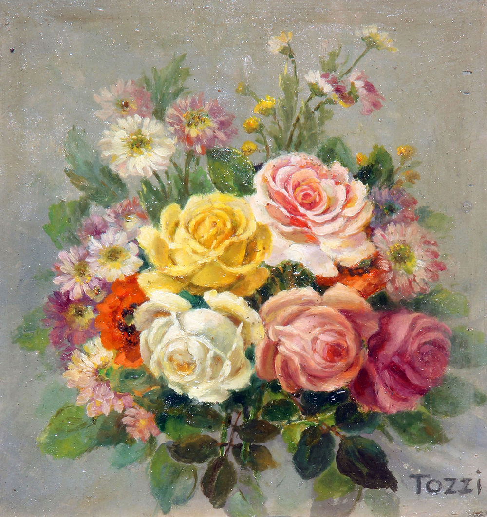Mario TOZZI (Fossombrone (Ps) 1895-10-30 Saint Jean du Gard 1979-09-08) Rose e fiori 1916 olio su tavola cm. 23 x 20Firma "Tozzi" (in basso a destra) Autentica dell'Archivio Mario Tozzi con n. 2442 e prot. n. 121A/17