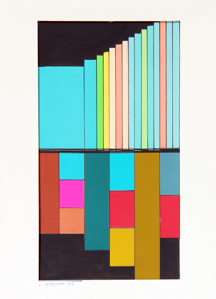 Luigi VERONESI (Milano 1908-05-28 Milano 1998-02-25) Geometrie 1982 collage e tecnica mista su cartoncino cm. 26 x 13.5Firma, data "L. Veronesi, 82" (in basso a sinistra)
