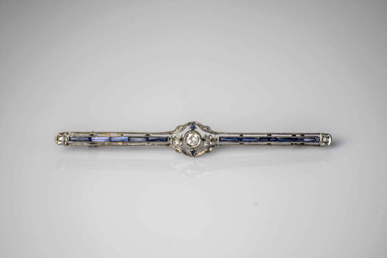Spilla art decò in oro bianco, gr 3.70. Zaffiri baguette e brillanti cts...