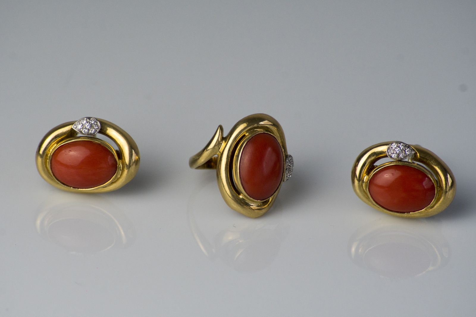 [Nessun Autore] 18kt yellow gold ring, total gr 24.04, with diamonds cts 0.23 and cabouchon corals. . .
