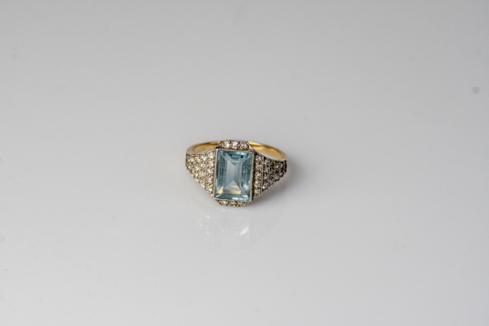 Anello art decò in oro diamanti ouit ouit cts 0.42 e al centro una pasta vitrea color acqua marina. . . .