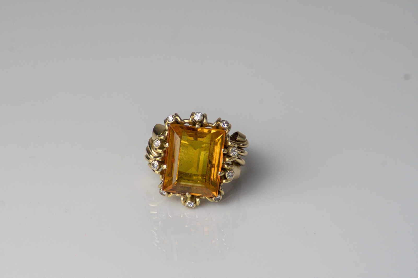 [Nessun Autore] 40's 18kt gold ring, gr 17.20. Diamonds cts 0.25. Citrine quartz in the centre. . .