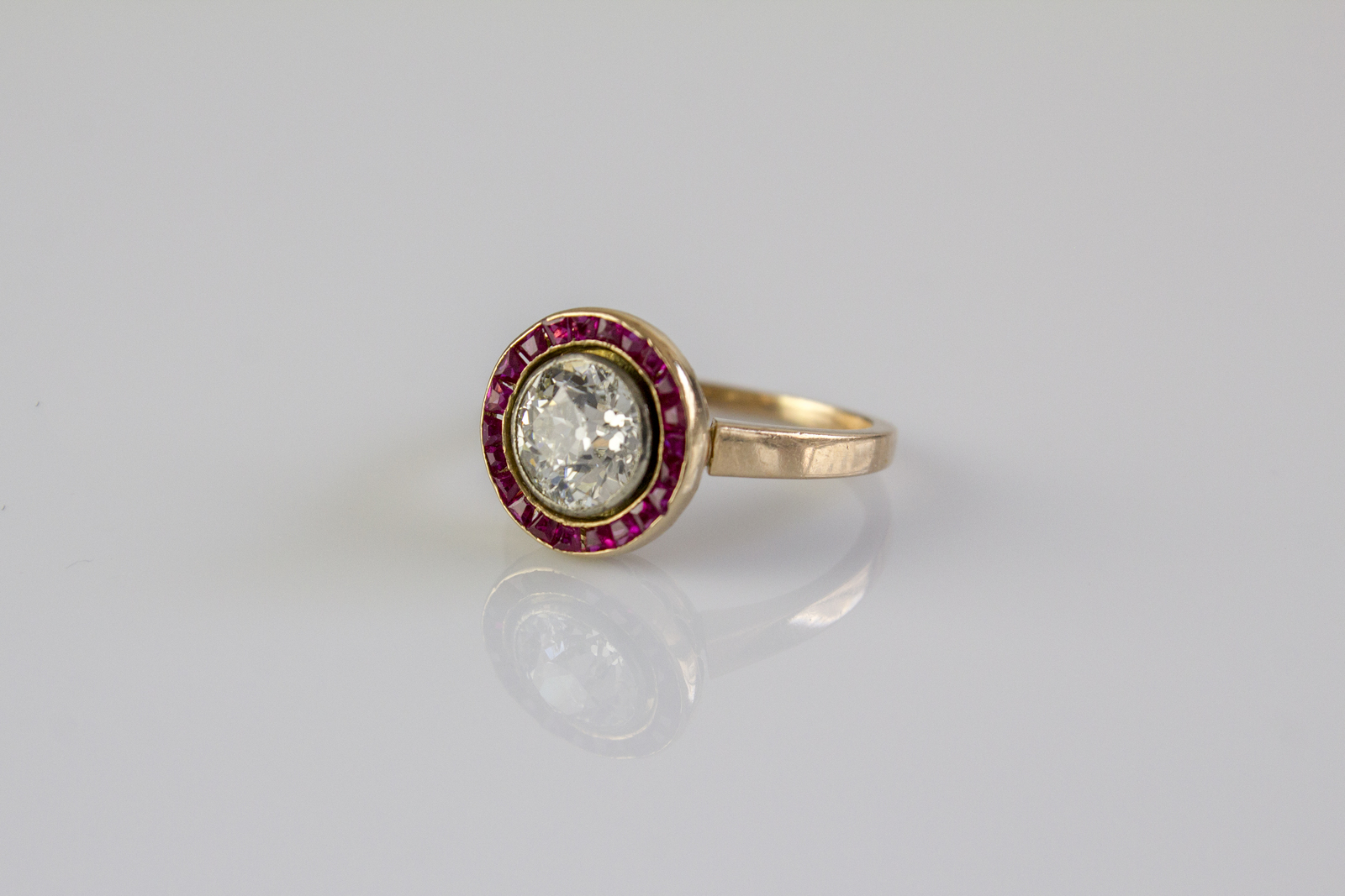 Anello in oro rosa 18kt, gr 3,63. Diamante taglio antico cts 1.25, contornato da rubini tagliati a trapezio. . . .