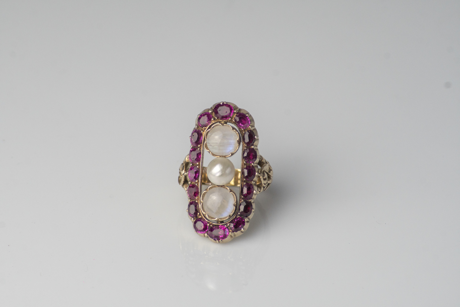 Anello fine 800 in oro giallo, gr 12.50, con gambo inciso a mano contornato da rubini, due adularie e una perla naturale. . .