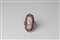 [Nessun Autore] Late 800's yellow gold ring, gr 12.50, with hand graven stem sorrounded with rubies, two moonstone and one natural pearl. . .