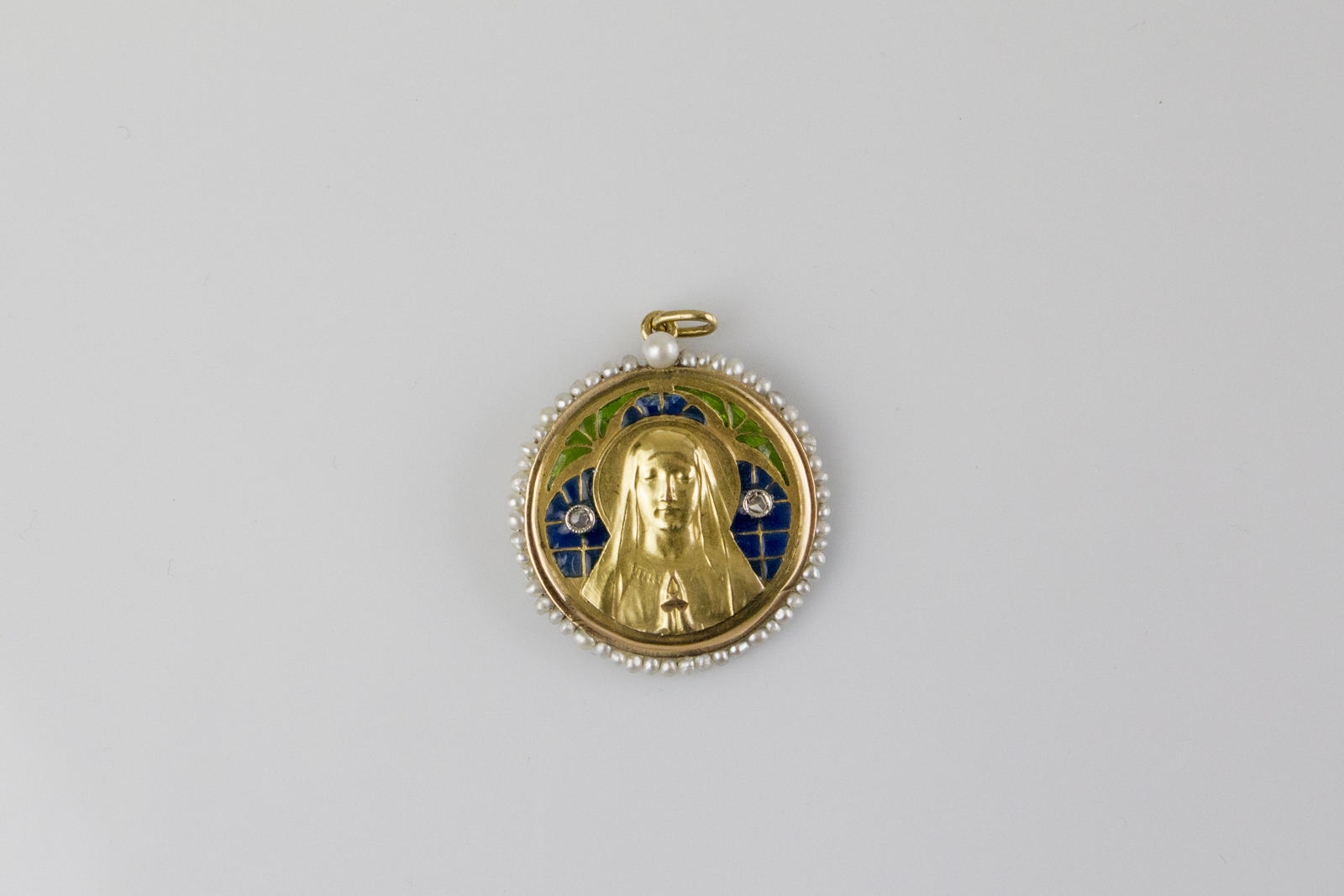 Ciondolo con vergine maria del 1829, gr 4.64. In oro smalti e perline. . .