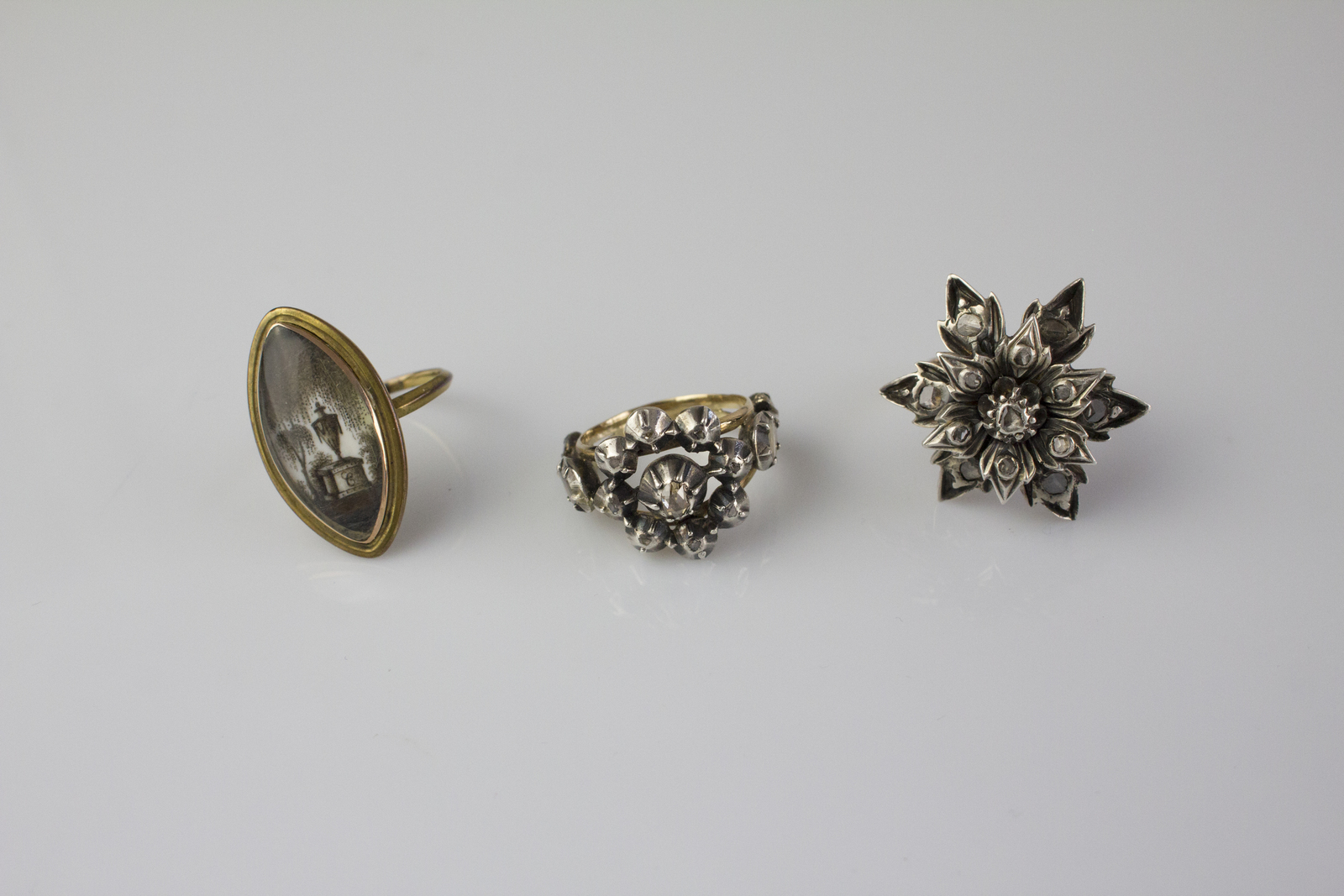 Lotto di tre anelli in oro, argento, diamanti rose cut e miniatura. . .