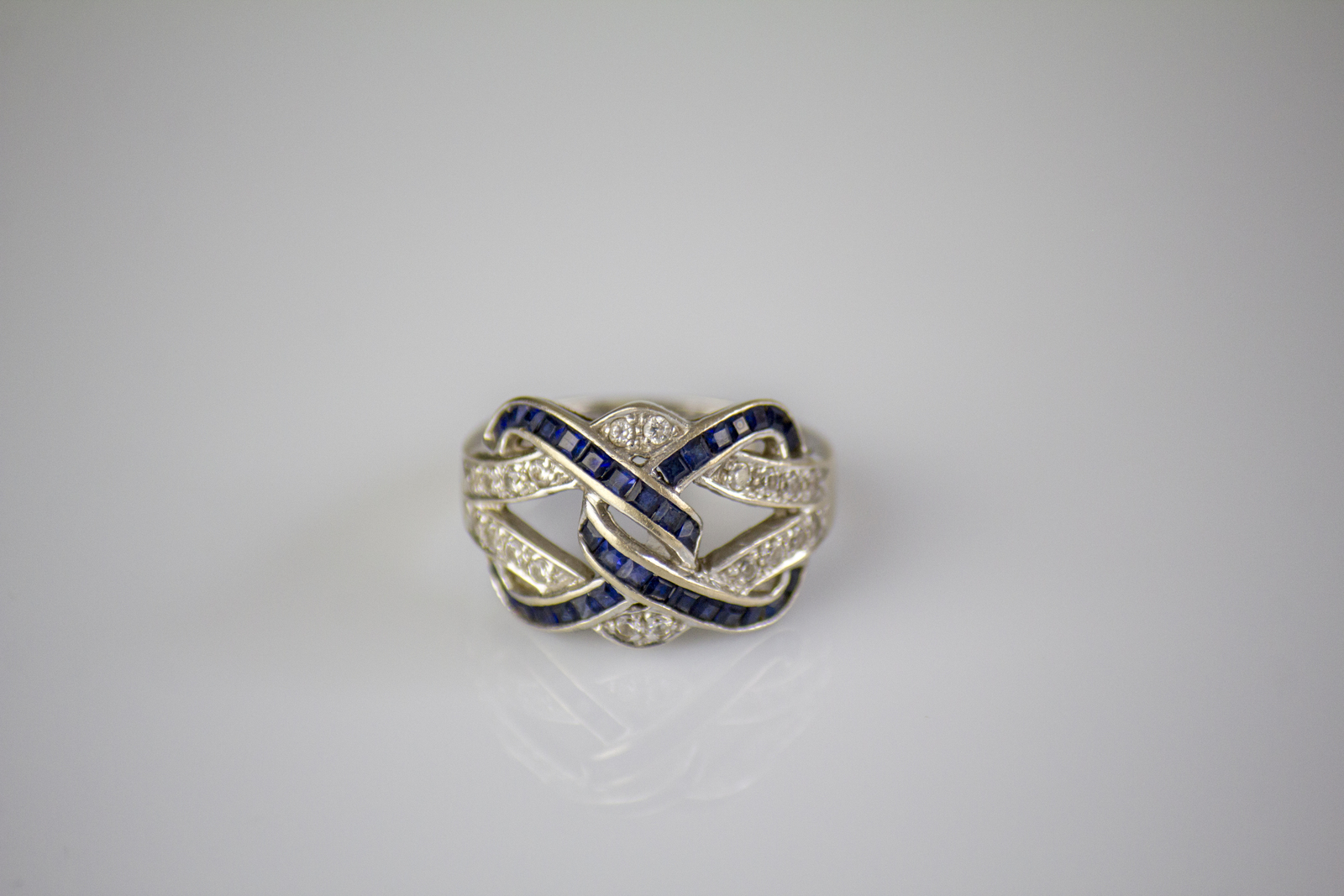 [Nessun Autore] 18kt white gold ring, total gr 6. Diamonds cts 0.20. Carrè sapphires cts 1 approx. . .