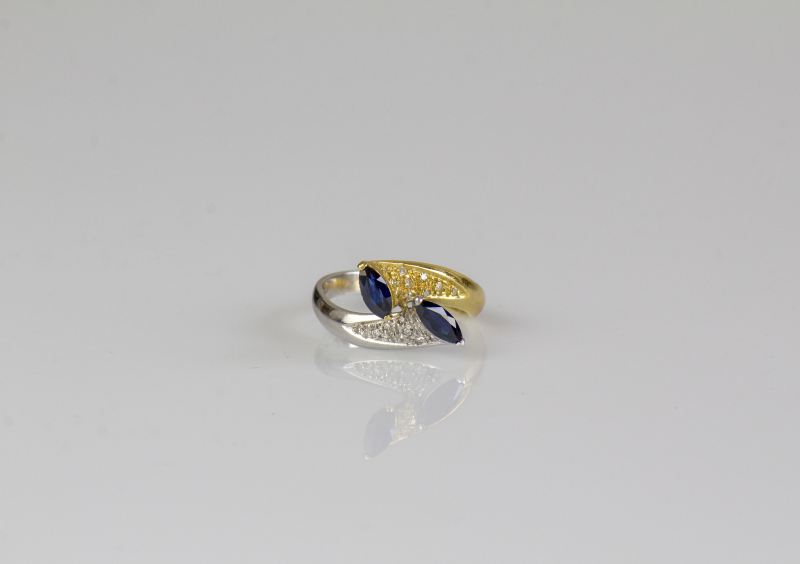 [Nessun Autore] White and yellow 18kt gold contrarié ring, gr 5. Diamonds 8X8 cts 0.20 approx. Sapphires cts 0.30. . .