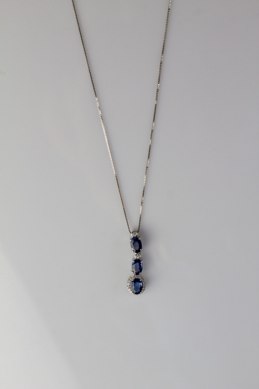 Catenina in oro bianco 18kt, gr 3.56. Con zaffiri cts 2.03. Contorno di diamanti cts 0.13. . .