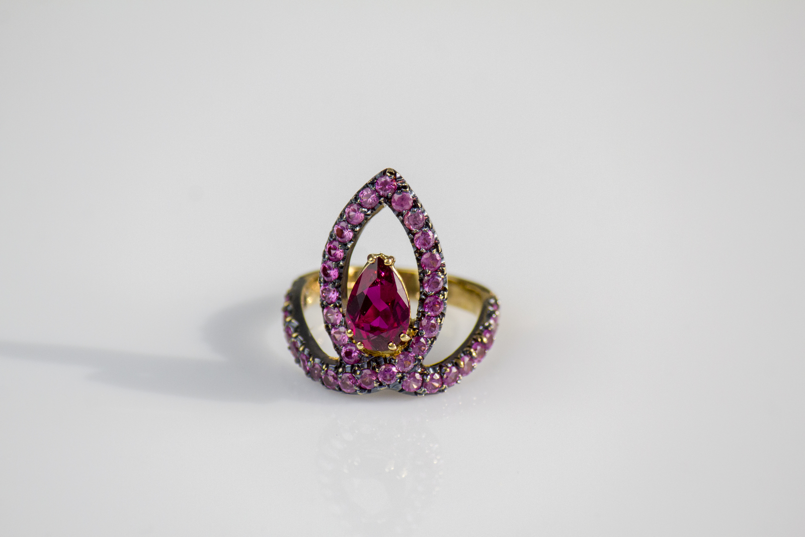 [Nessun Autore] Yellow 18kt gold ring partially burned, gr 7.10. Pink sapphires cts 1.61. Pear shaped rubellite cts 1.25. . .