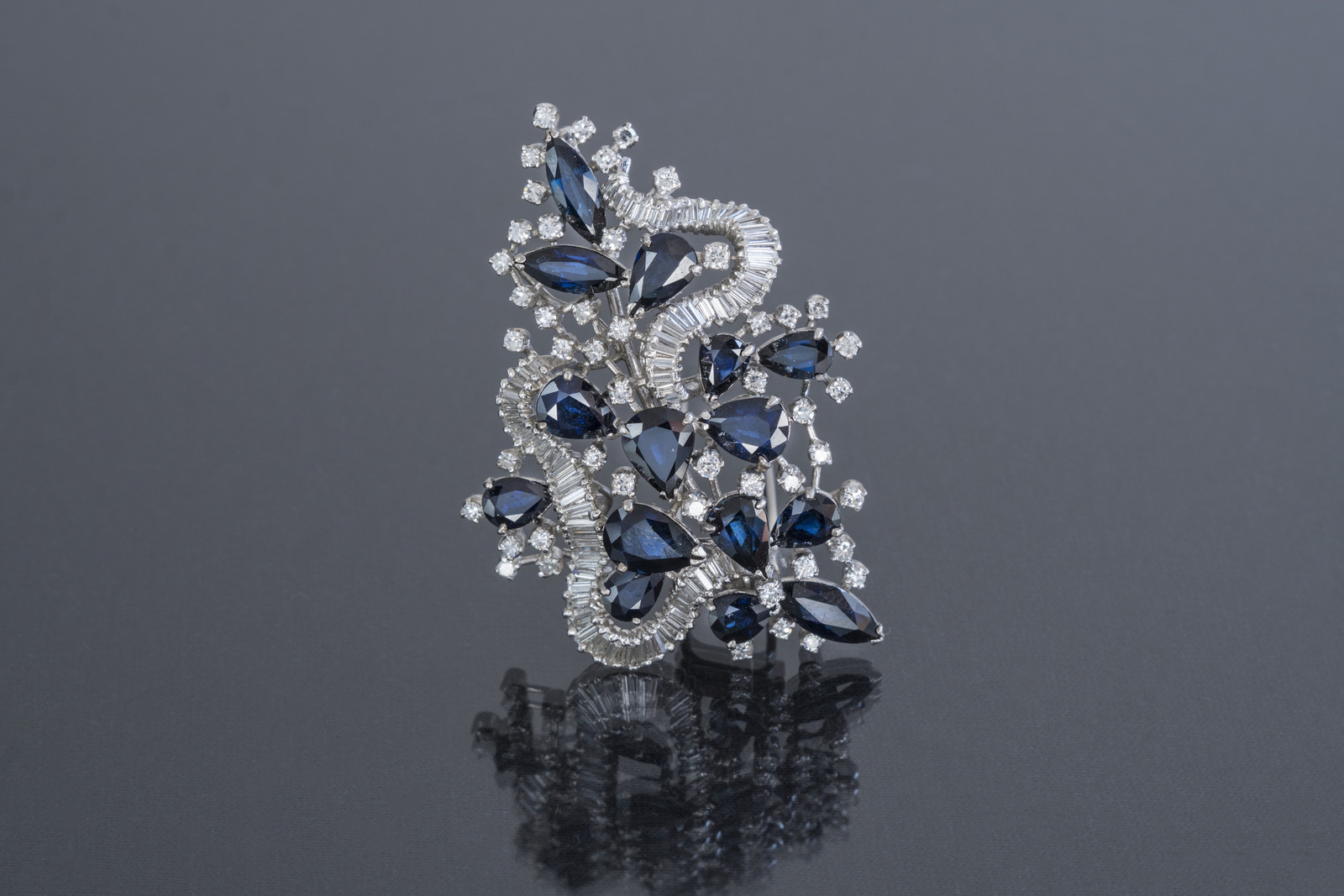 [Nessun Autore] Spilla in oro bianco, gr 18, con zaffiri presumibilmente naturali, ct 13 circa e diamanti, ct 2.80 circa. . .
