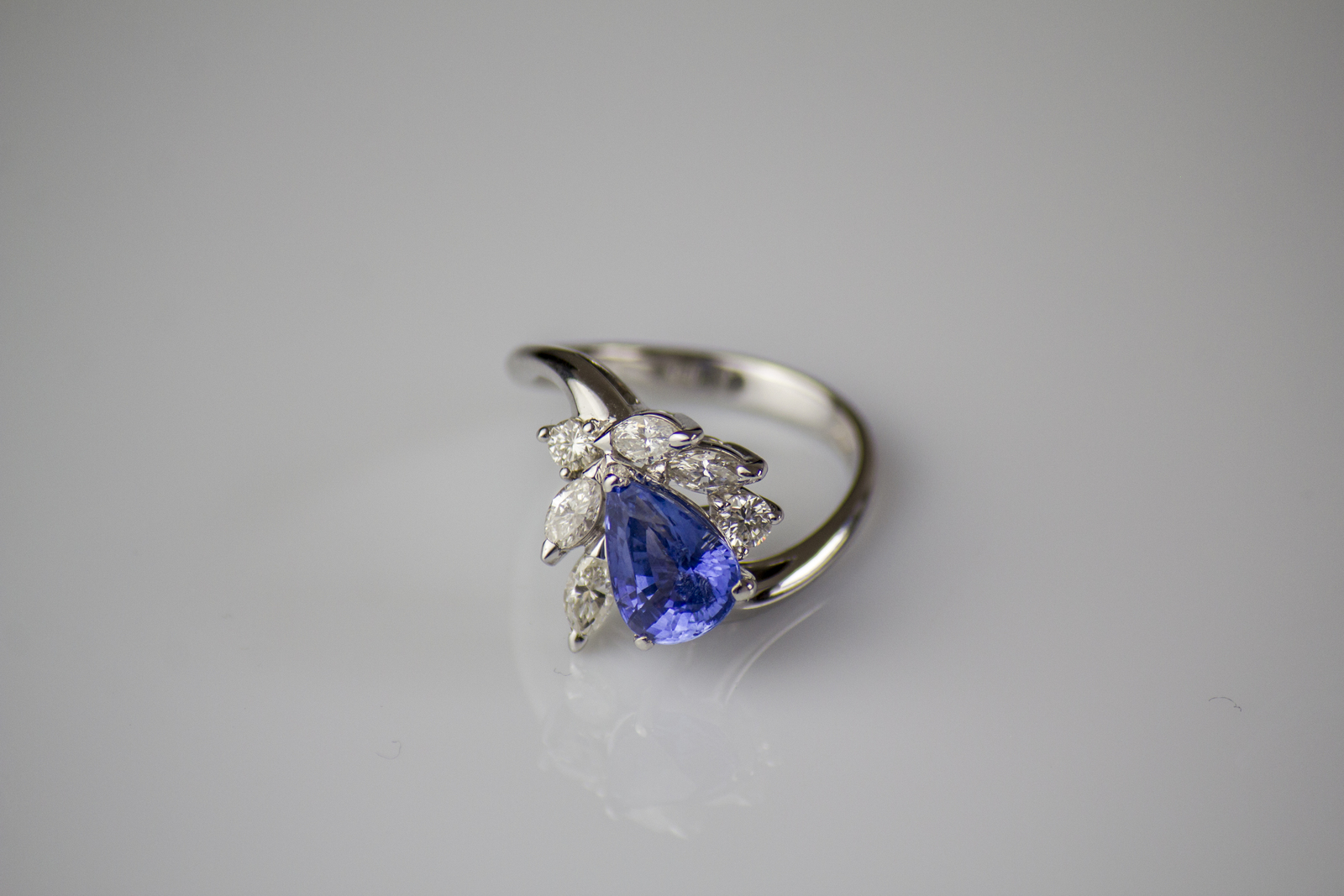 [Nessun Autore] 18kt white gold ring, gr 5. Pear shape sapphire cts 2.18. Navette diamonds cts 0.72. . .