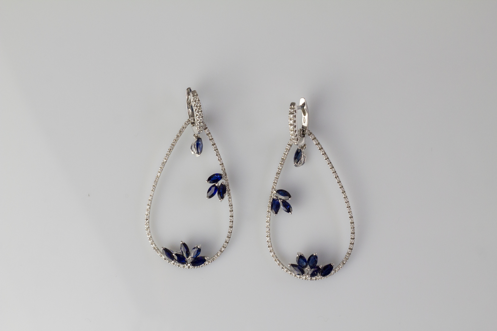 [Nessun Autore] 18kt white gold earrings, gr 9. Diamonds cts 0.84. Navette sapphires cts 4.96. . .