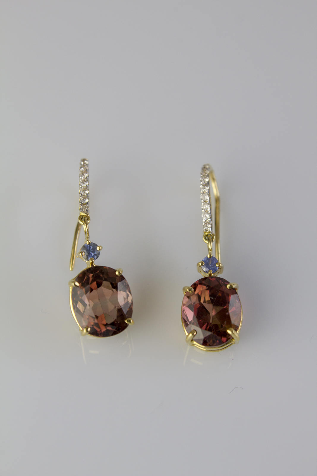 Paio di orecchini in oro giallo 18kt, gr 4,38, tormaline e diamanti cts 0,19....