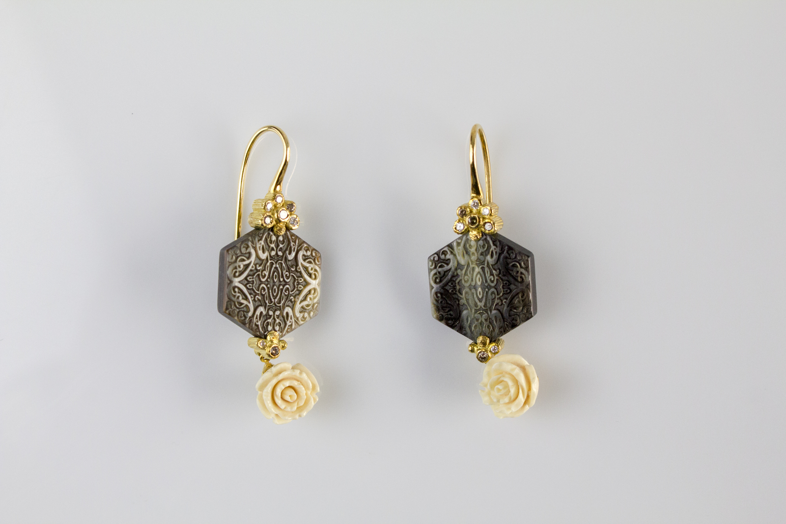 [Nessun Autore] Gold earrings, gr 6.3. Diamonds cts 0.33. White coral and graven motherpearl. Signed leaderlines. . .