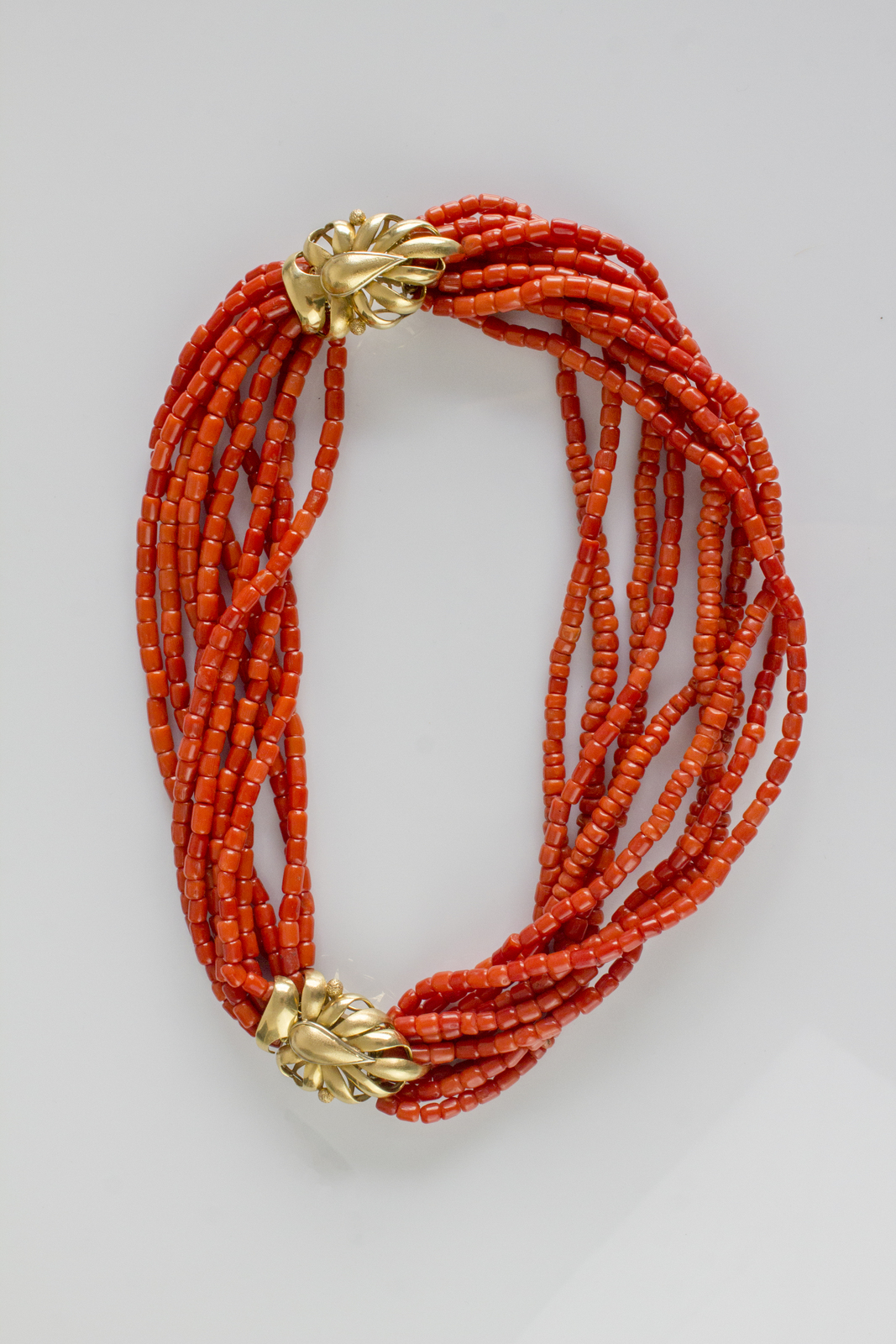 [Nessun Autore] 10 strands of red mediterranean coral in small barrels, total gr 175, with two yellow 18kt gold clamps, supposedly gr 40. . .