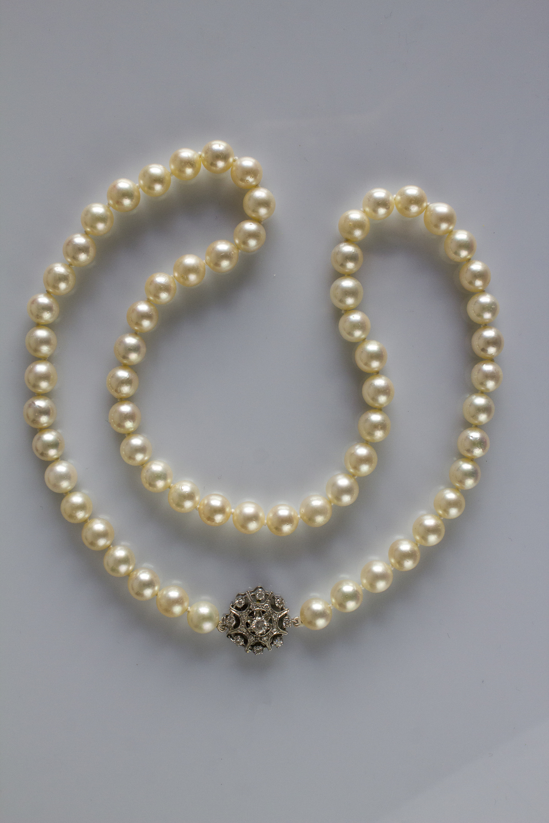 [Nessun Autore] Japanese cultured pearls 8.5/8.7mm with white 14kt gold clasp. Diamonds cts 0.75 approx. . . .