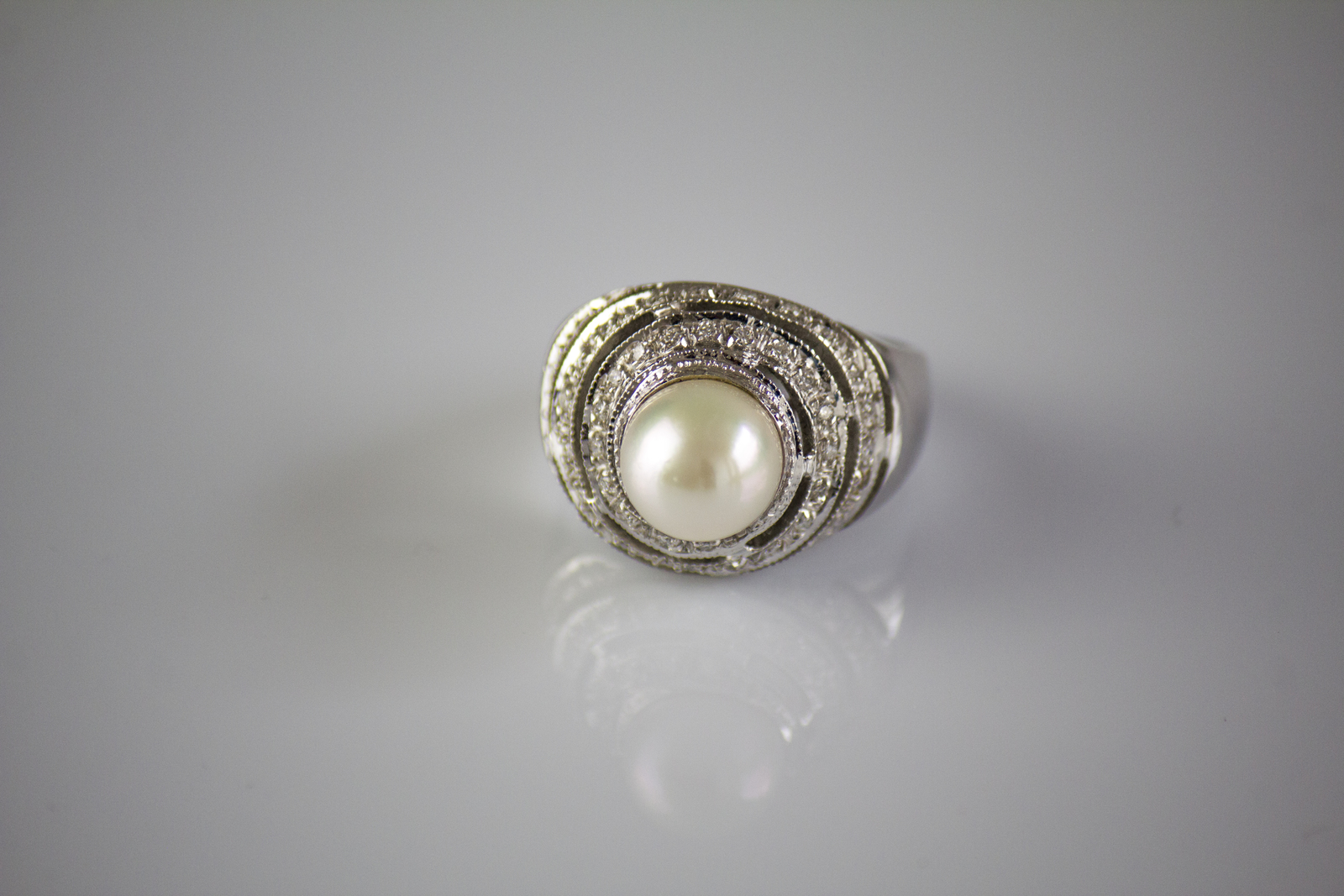 [Nessun Autore] 18kt white gold ring, total gr 12.7. Diamonds cts 0.36. Cultured pearl 9.25mm. . .