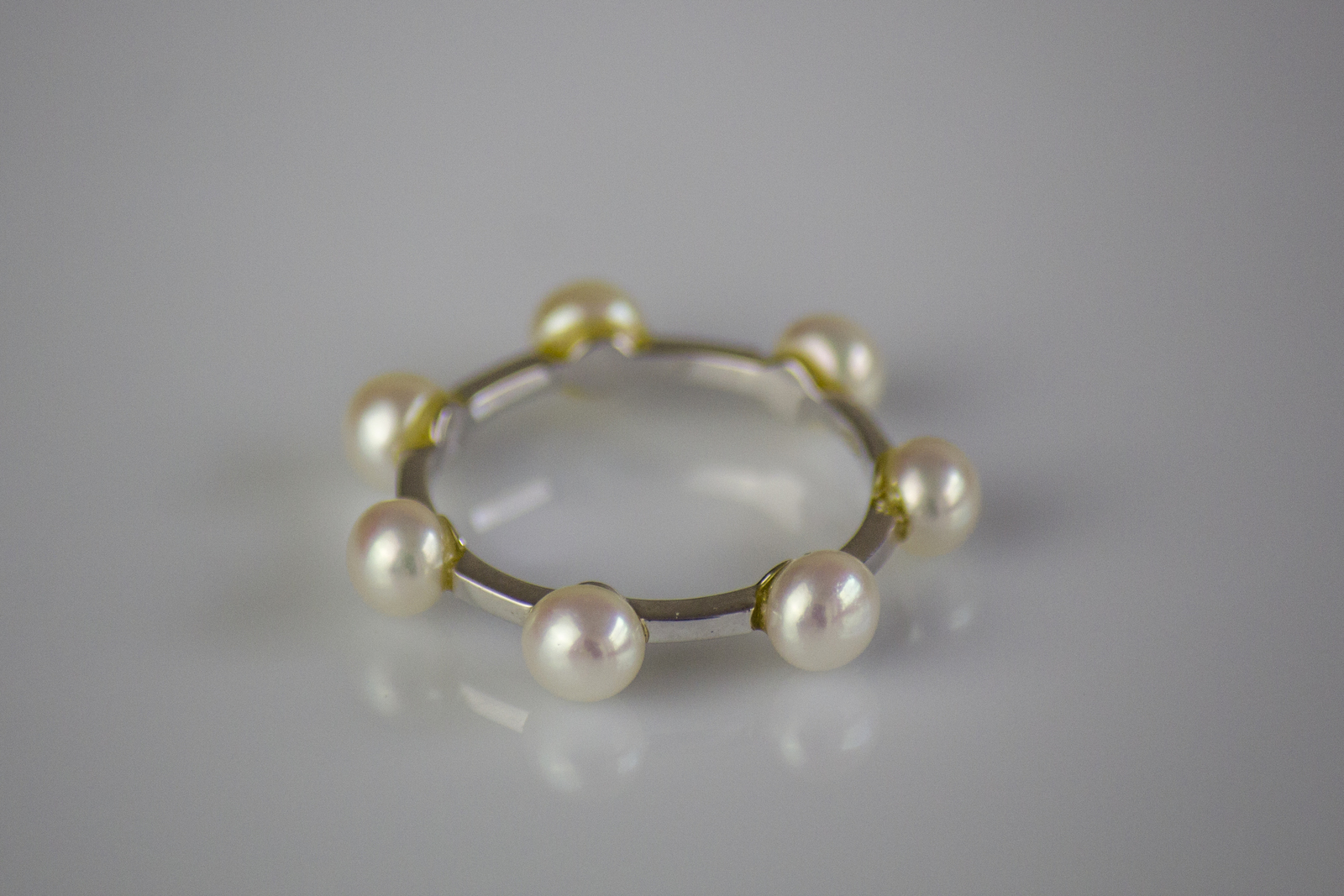 Anello in oro bianco 18kt con perline bianche, gr complessivi 2.10. . .