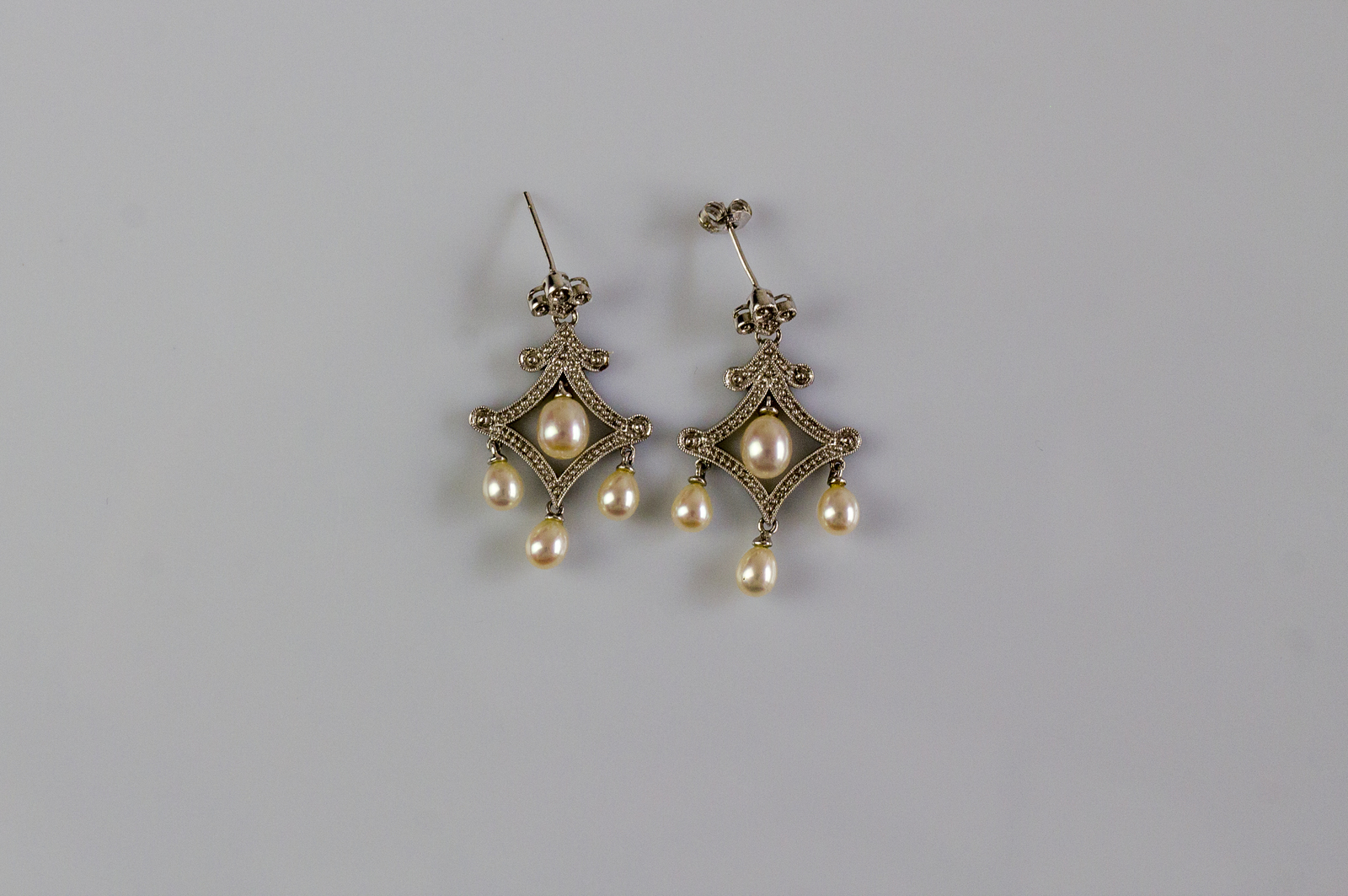 Orecchini chandelier in oro bianco 18kt e perline. . .