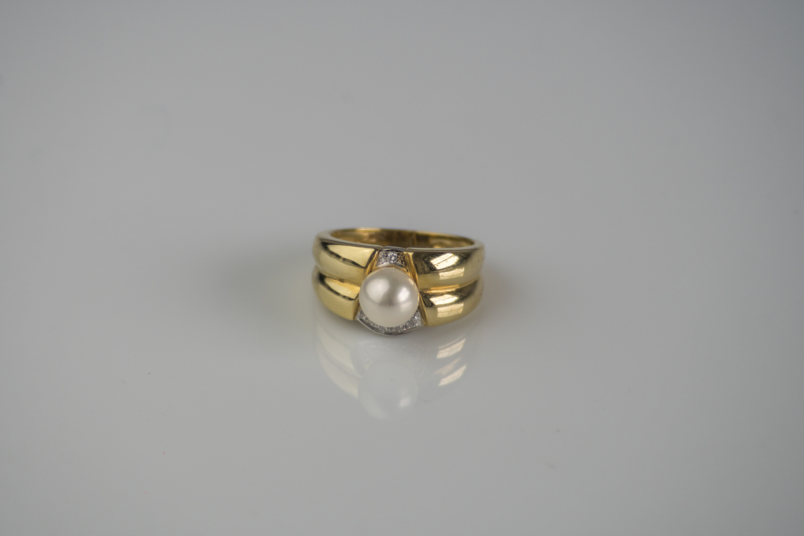 [Nessun Autore] 18kt yellow gold ring, gr 7.50, with pearls. Diamonds cts 0.05. . .