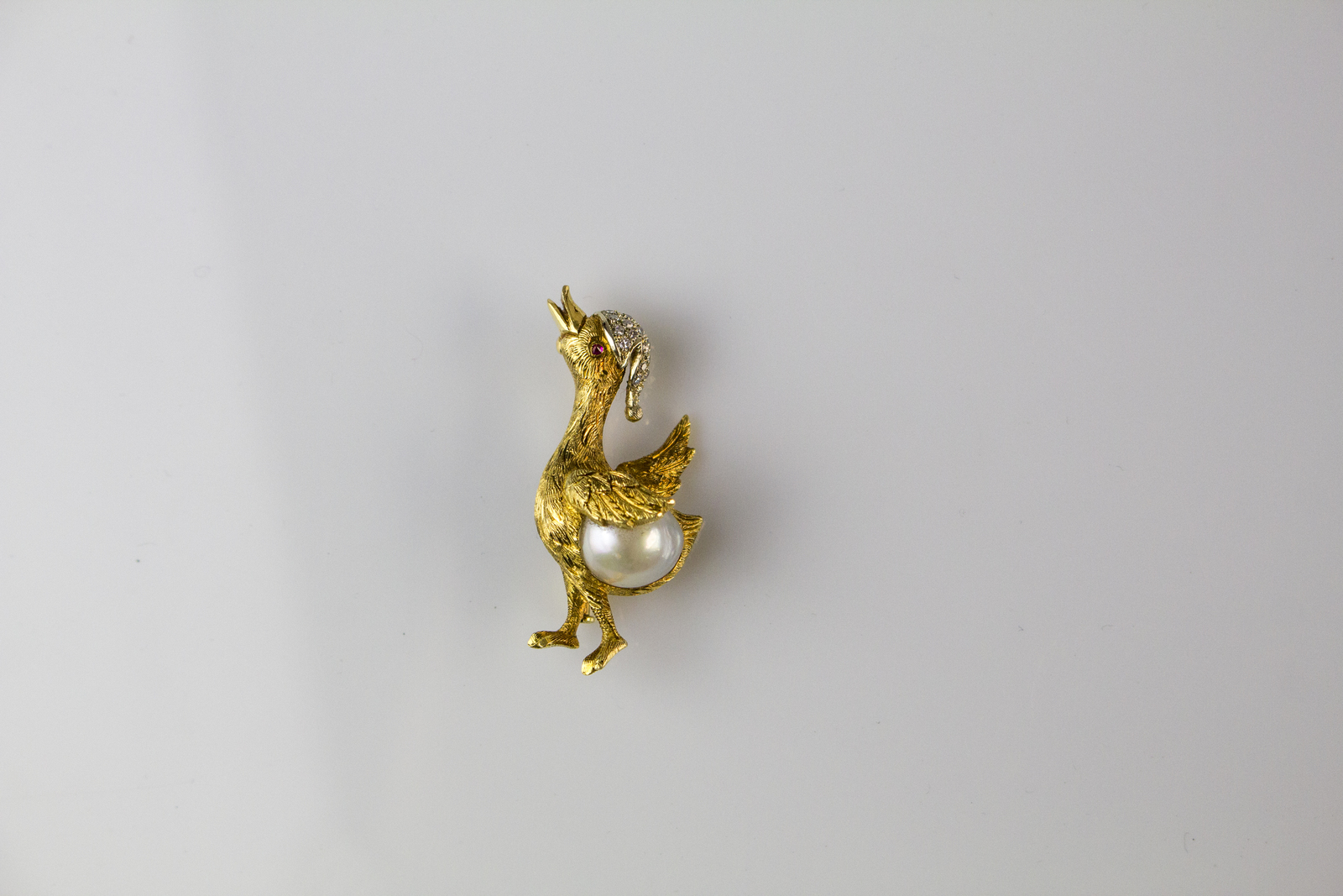 [Nessun Autore] 18kt gold brooch, gr 9.66, depicting a goose with ouit ouit diamonds cap and central pearl body. . .