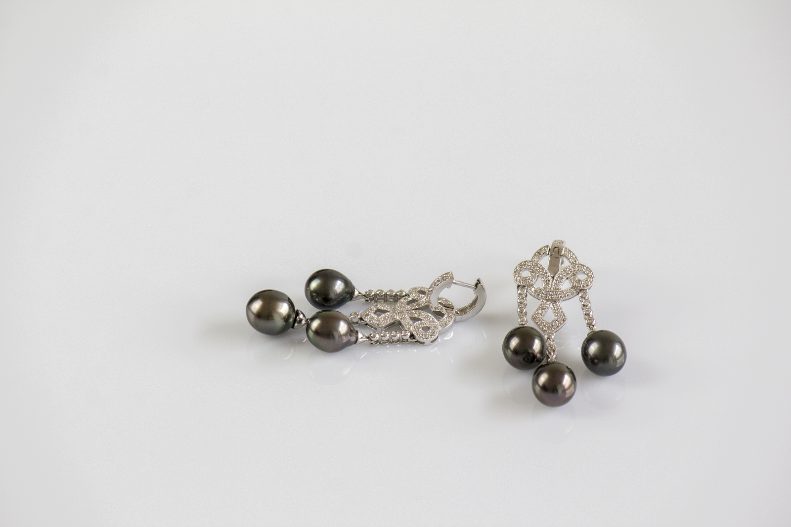 Orecchini chandelier in oro bianco 18kt. Diamanti cts 0.27. Perle thaiti 8.5mm. . . .