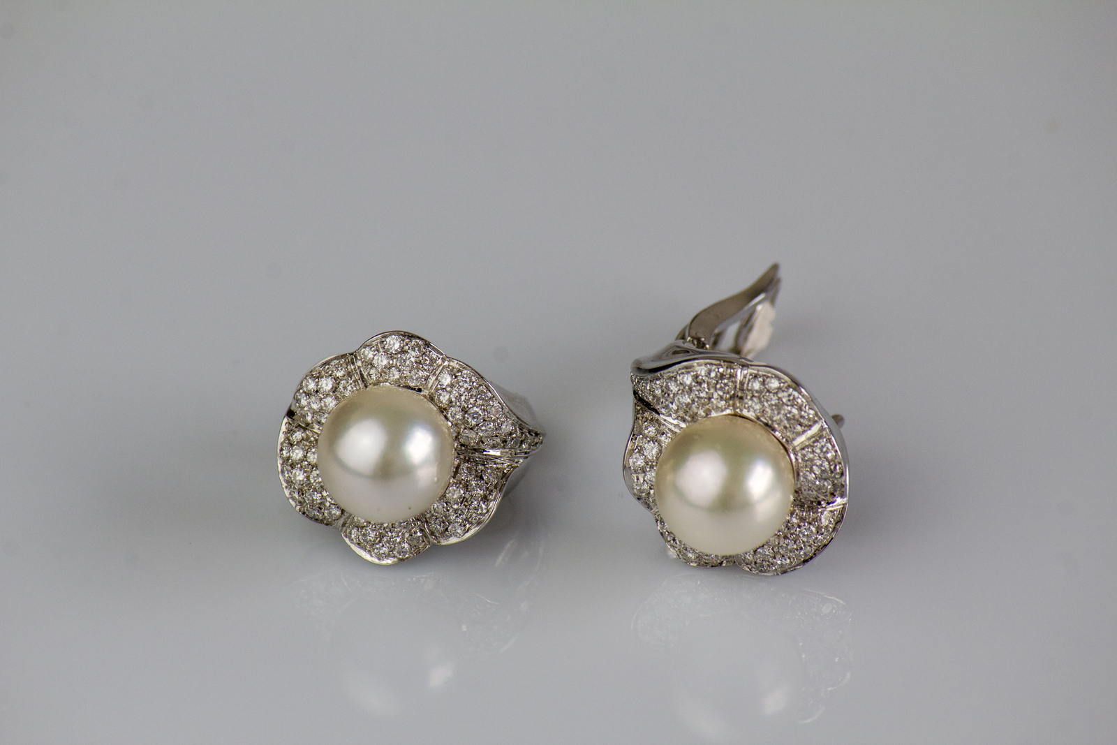 [Nessun Autore] White 18kt gold, gr 14, with two japanese pearls 9mm. Diamonds cts 0.79. . . .