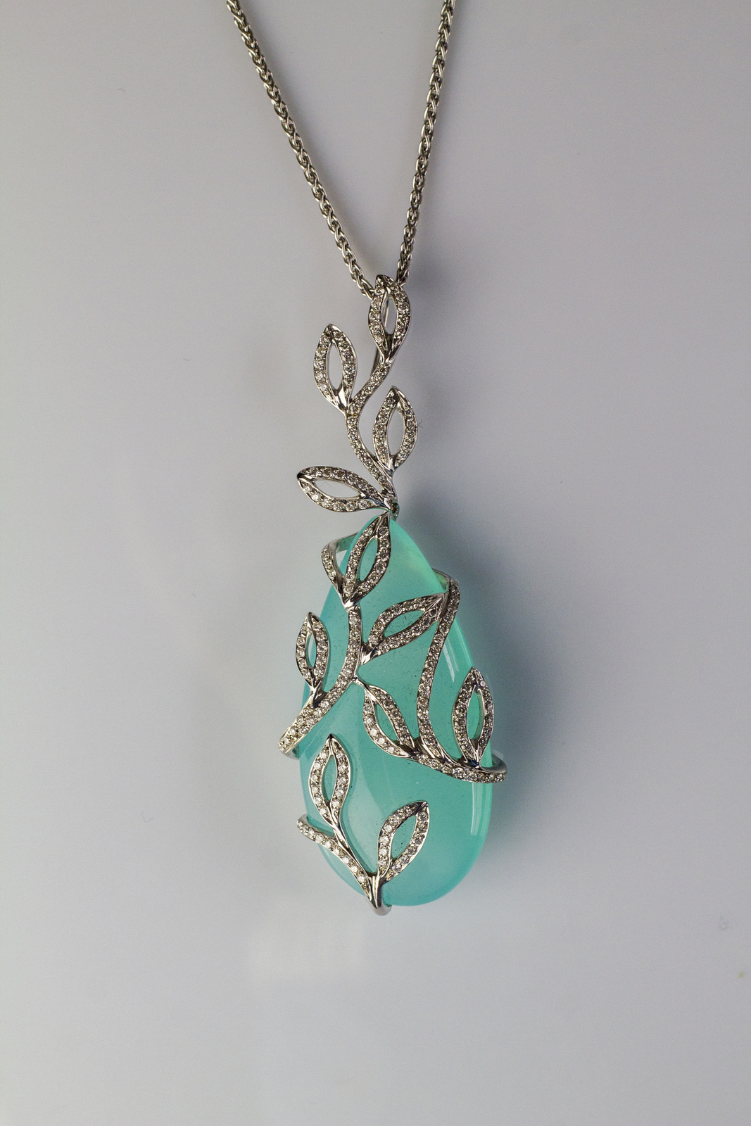 Catena pendente in oro bianco 18kt, gr 27, con calcedonio e diamanti cts 1.93. . .