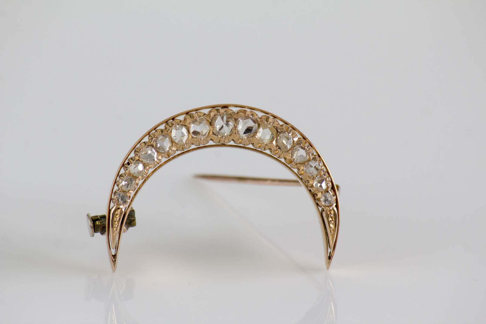 Spilla a mezza luna in oro rosa 18kt, gr 8. Diamanti rose cut. . .