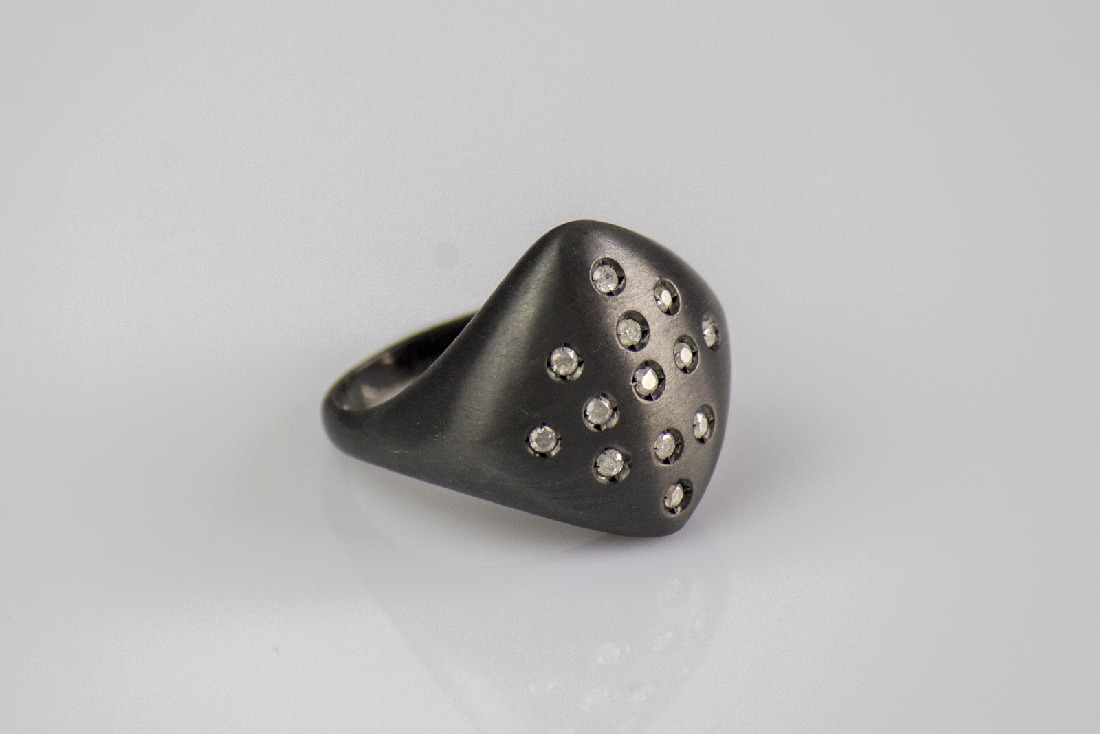 Anello in argento brunito, gr 7.60. Diamanti iced cts 0.20. . .