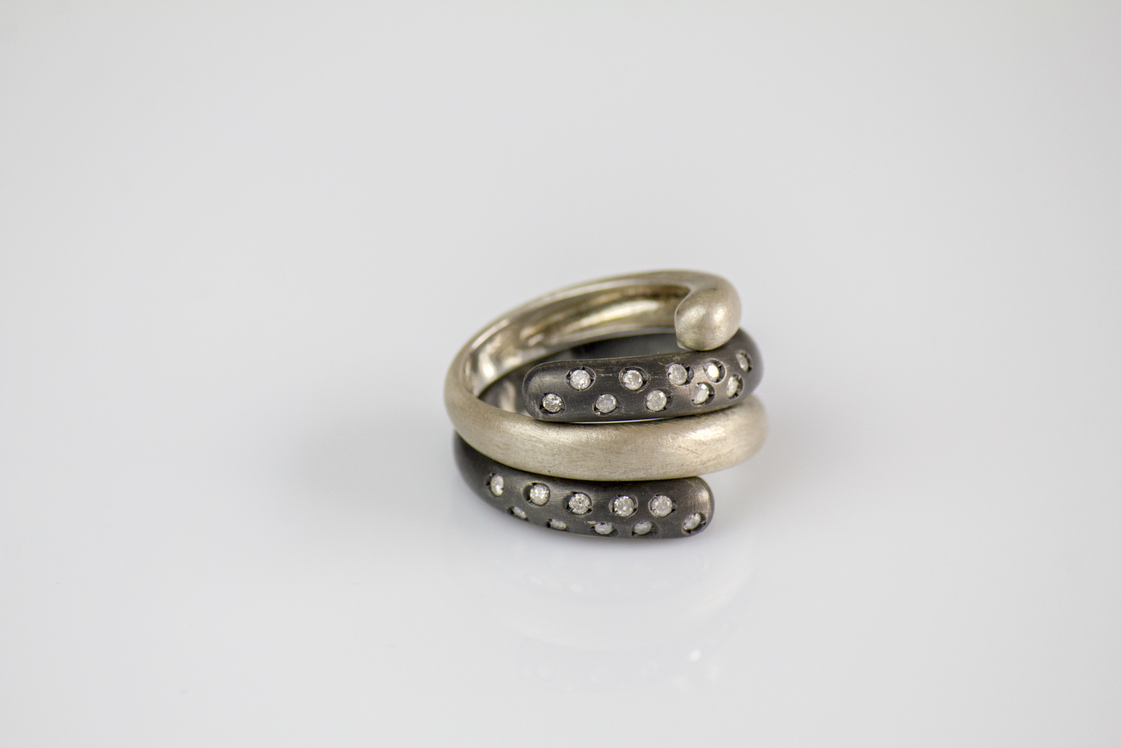 Doppio anello in argento satinato e argento brunito, gr 12.0. Diamanti iced...