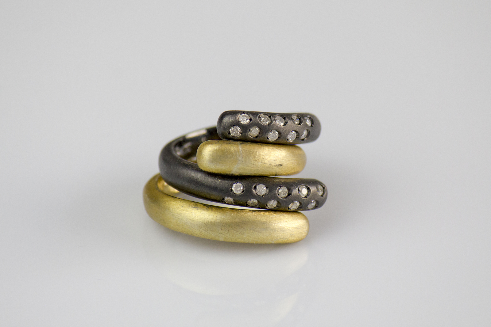 [Nessun Autore] Double snake shape ring made in golden silver and burnished, gr 12.10. Diamonds cts 0.14. . .