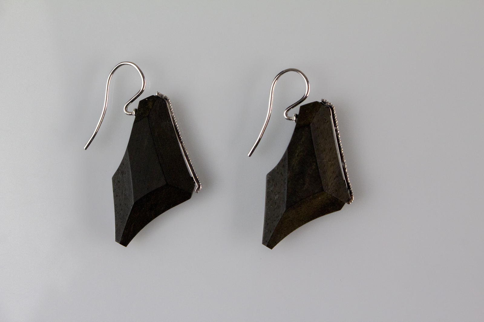 Orecchini in ebano e oro bianco, gr 2.8. Diamanti cts 0.28. Firmato leaderline. . .