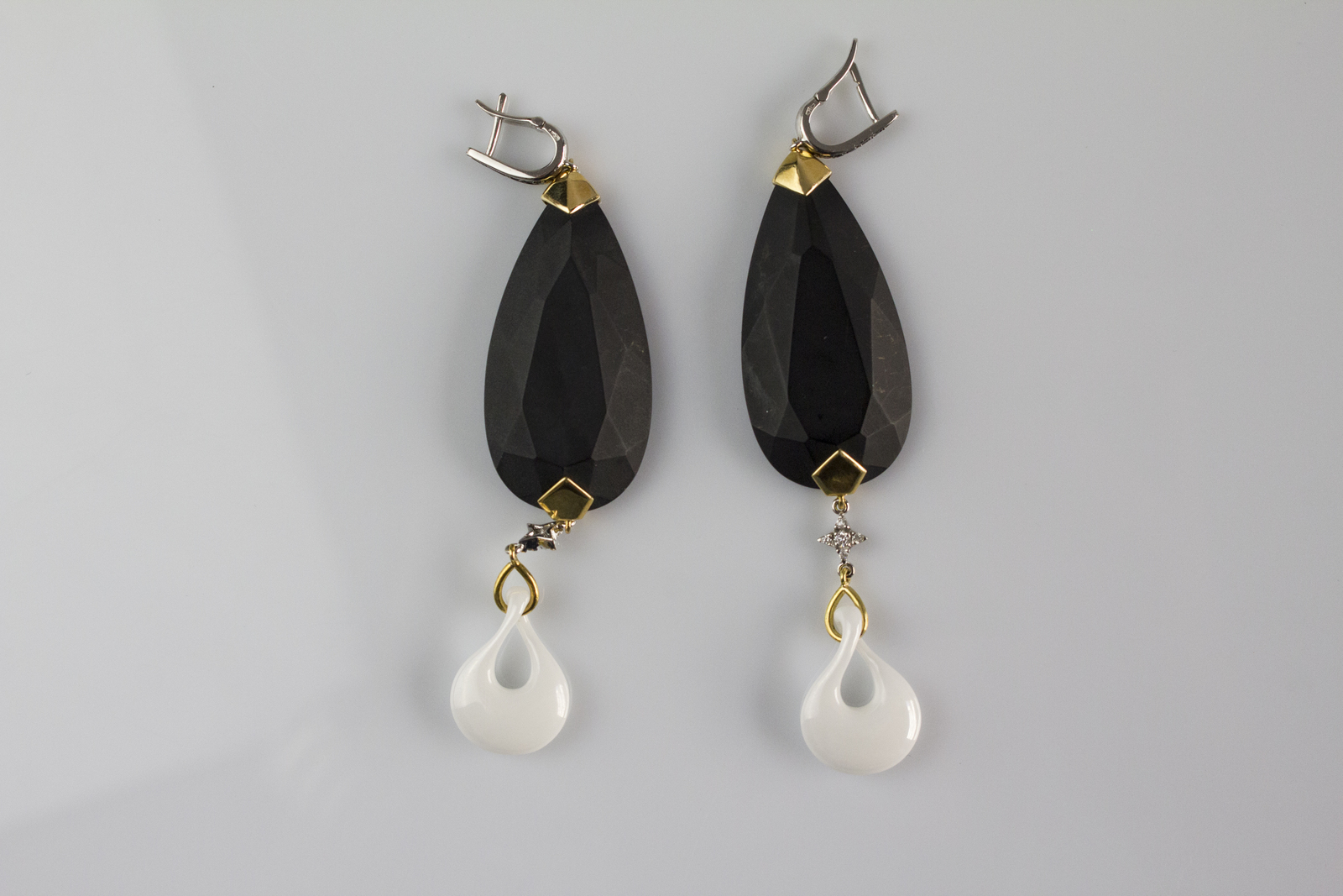 [Nessun Autore] Ebony earrings. Gold, gr 6.30. Black and white diamonds cts 0.24 and ceramic. Signed leaderline. . .