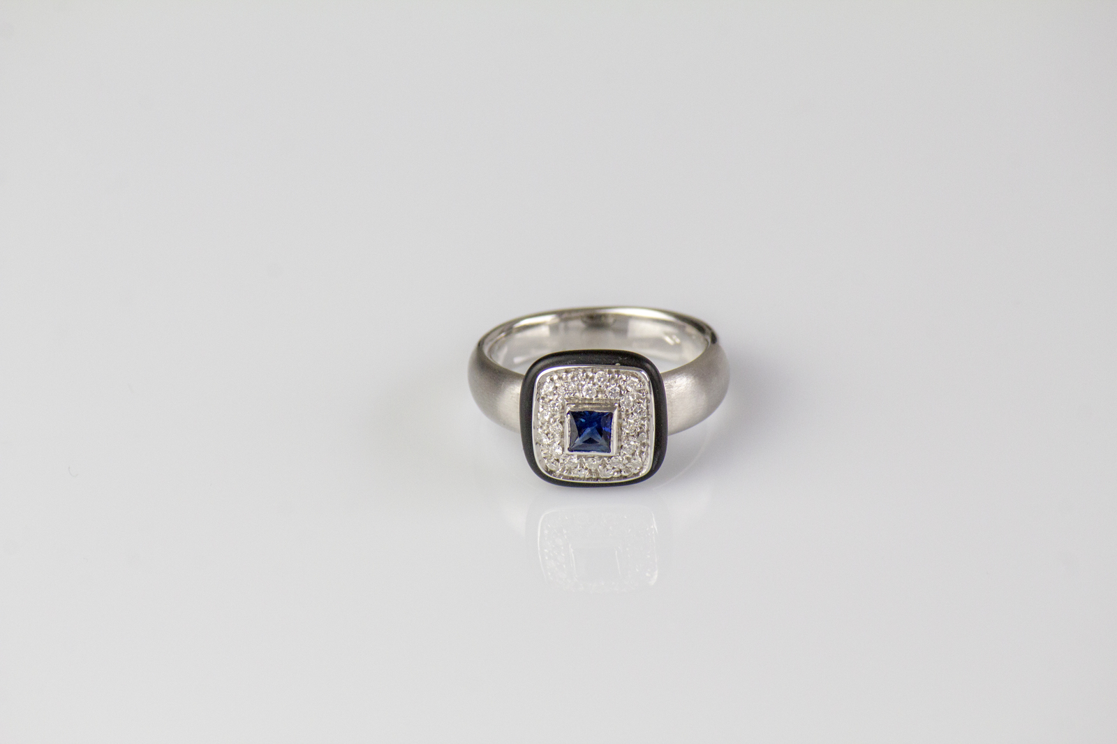[Nessun Autore] White 18kt gold ring, gr 7.50. Diamonds cts 0.29 and a princess cut sapphire cts 0.10. Caucciù insert. . .