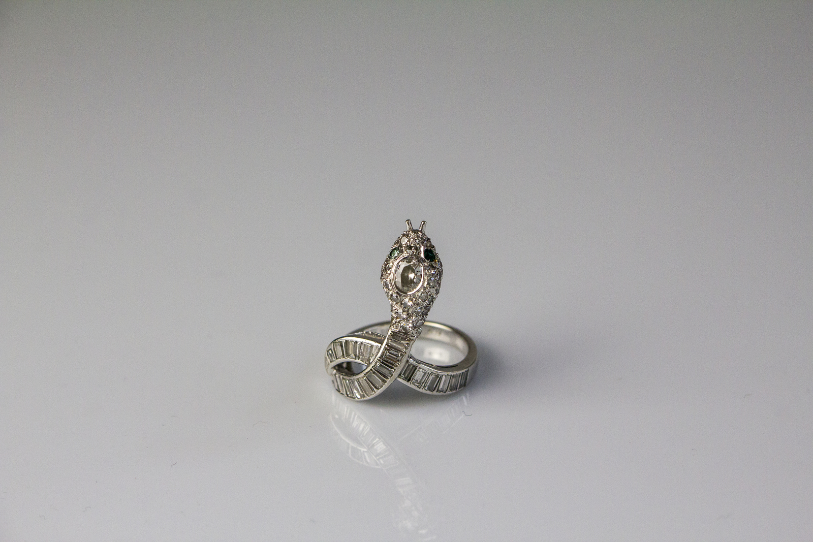 [Nessun Autore] Snake shaped 18kt white gold ring, gr 7.85. Baguette out out and one oval diamonds cts 0.20. . .