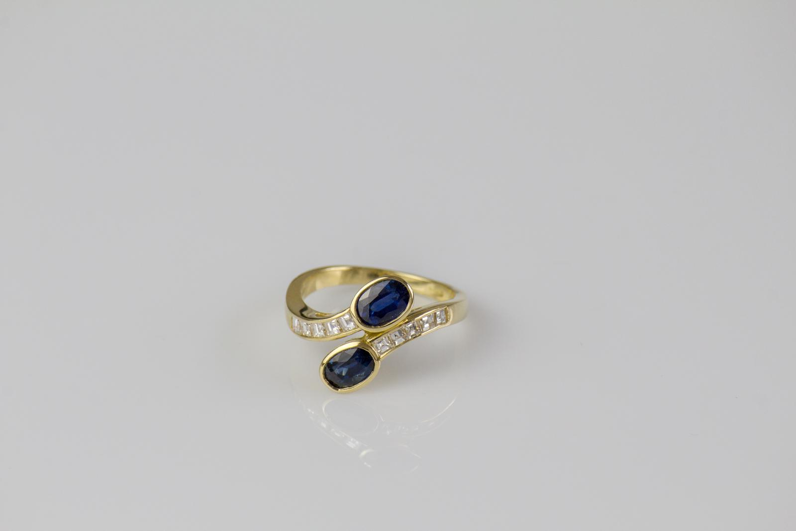 Anello contrarié in oro giallo 18kt, gr 4.80. Diamanti carré cts 0.40. Zaffiri cts 1.50 circa. . .