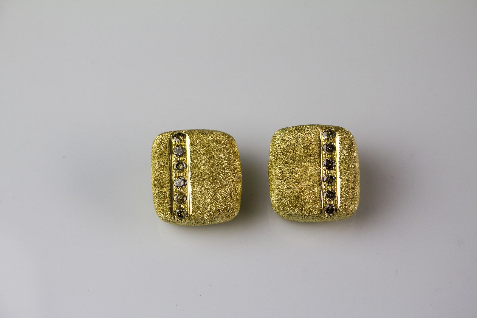 [Nessun Autore] 18kt frosted gold earrings, gr 27.30. Brown diamonds cts 0.48. . .