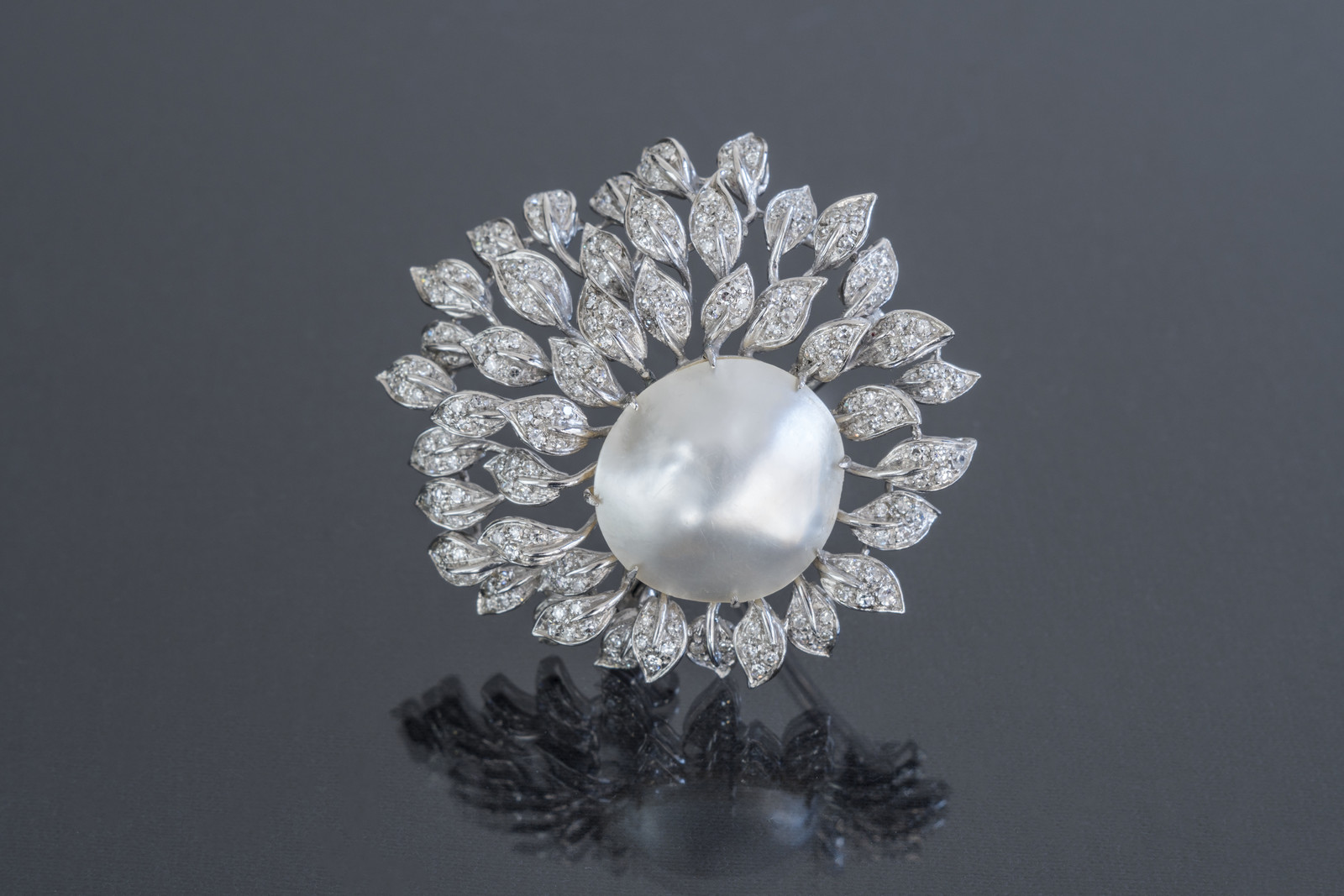[Nessun Autore] White gold brooch, gr 16, with Mabè pearl in the centre with diamonds ouit ouit cts 1.70 approx. . .